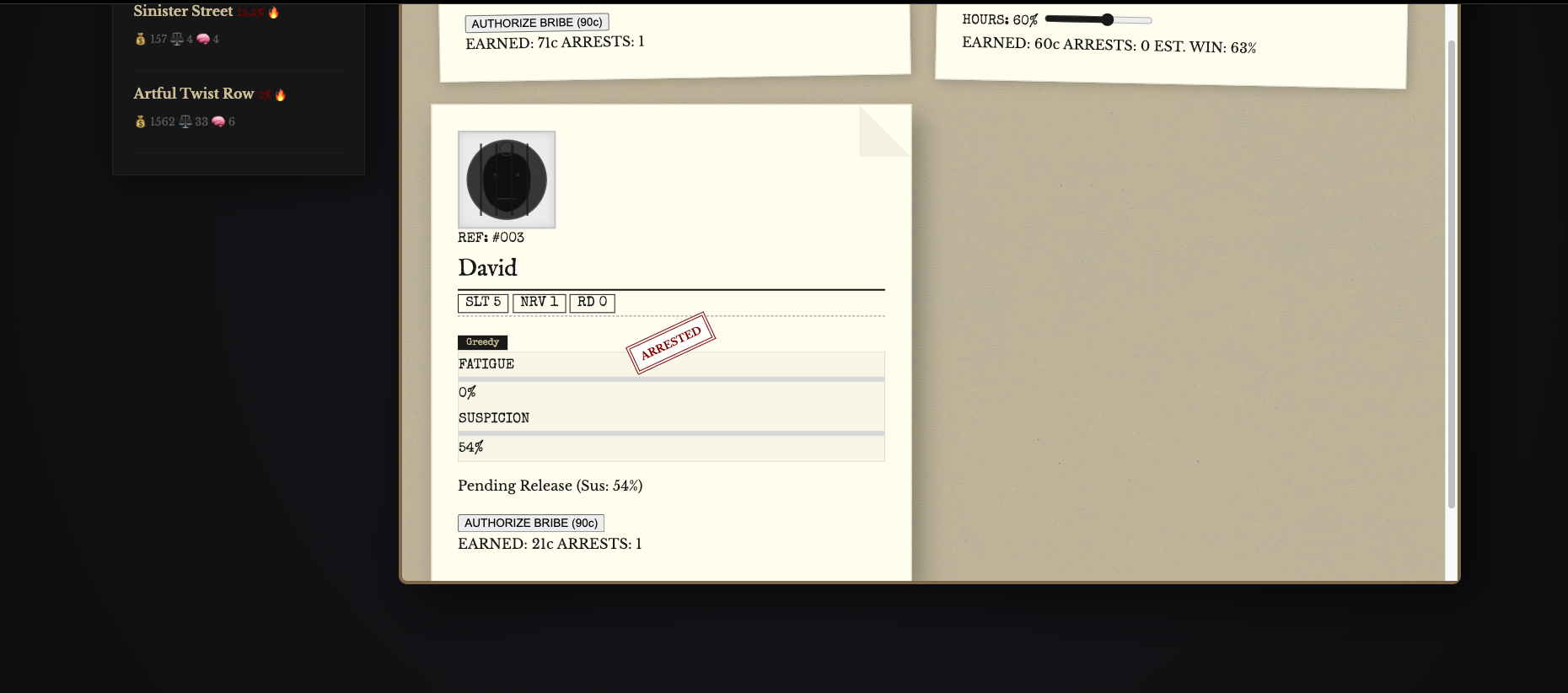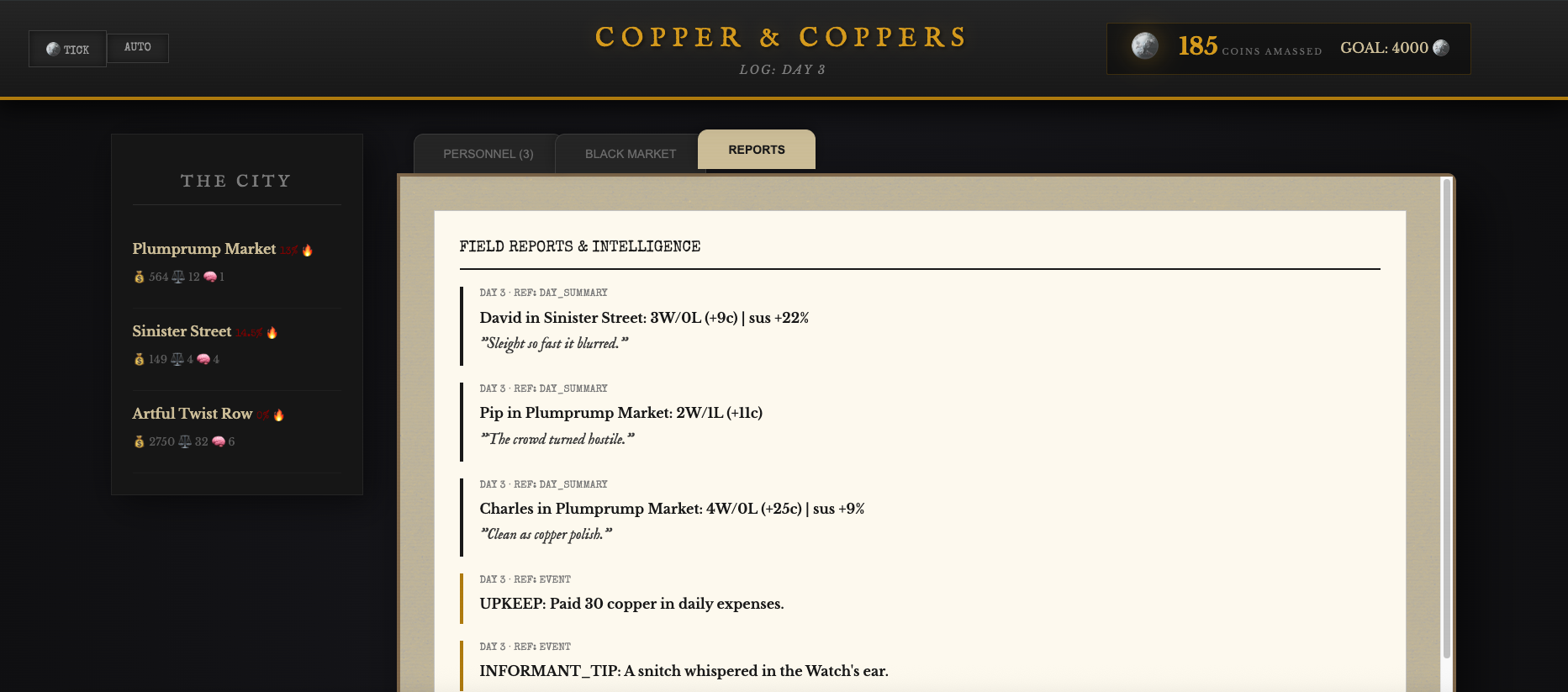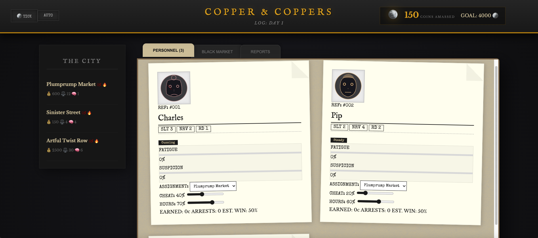 Copper & Coppers is a micromanagement crime simulation where you don’t control the outcomes, you only manage the people. Your goal is to amass 4,000 copper coins before your syndicate collapses or the law chokes the city into a peaceful slumber.